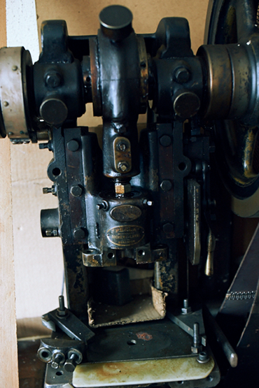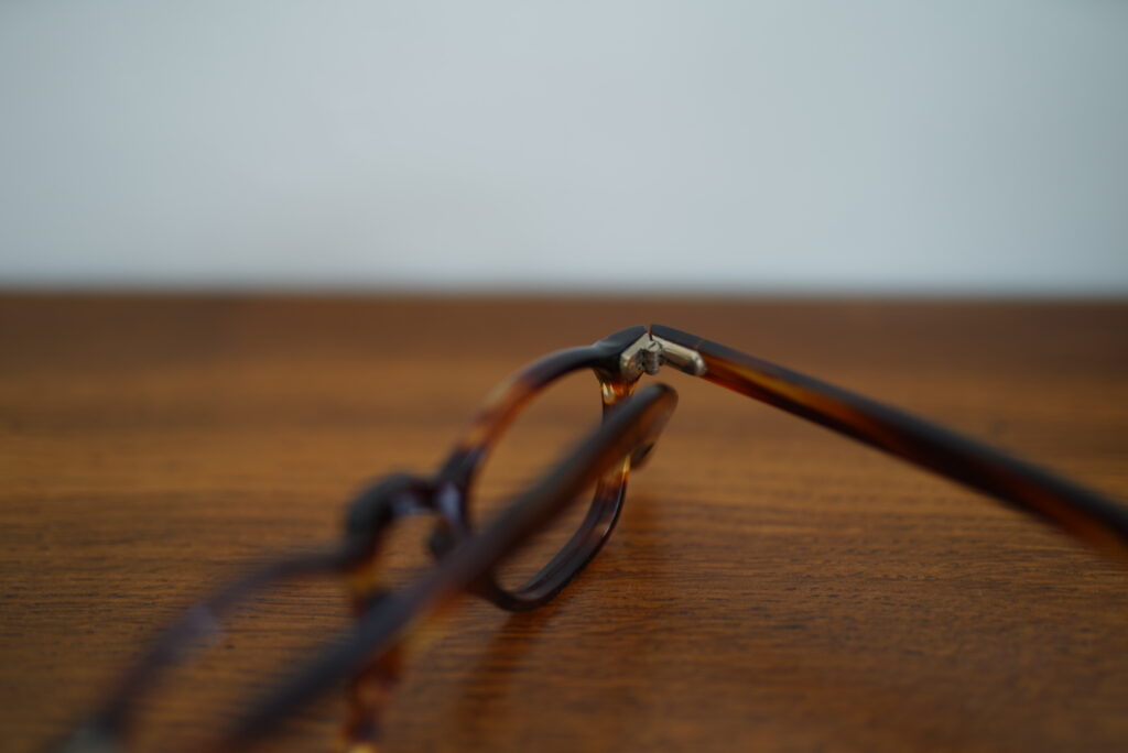 ヒンジ(フロントとテンプルをつなぐ小さな金具)をカシメる(圧力でつぶして固定する)のは1960年代初頭まで、それ以降はフレームの溝にはめ込む形で工程を簡略化しています。